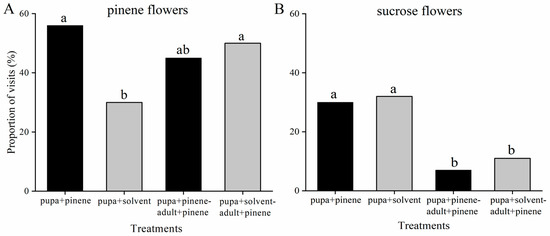 Effects of α-pinene exposure in the pupal stage on adult feeding preference. Percentage of adults visiting artificial flowers containing α-pinene + sucrose solution (A) or only sucrose solution (B). Pupa + pinene and pupa + solvent: the pupal stages were exposed to α-pinene or solvent, and the preference of the newly emerged adults was tested. Pupa + pinene-adult + pinene and pupa + solvent-adult + pinene: the pupal stages were exposed to α-pinene or solvent, respectively, and these adults were exposed to α-pinene for 3 d; then, their preferences were tested. Different letters indicate significant differences between treatments and controls (Kruskal–Wallis H test, p < 0.05).