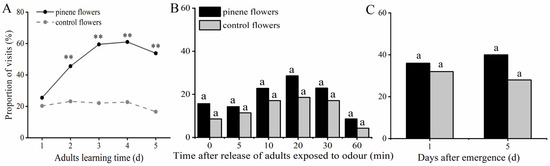 Effects of adult learning experience with α-pinene on feeding preference. (A) Percentage of adults visiting artificial flowers after training for 1–5 d; (B) percentage of adults (trained for 3 d) visiting artificial flowers during different periods after release; (C) percentage of naive adults (no learning experience) visiting artificial flowers on the 1st and 5th days after eclosion. Different letters indicate significant differences between treatments and controls (chi-square test, p < 0.05, ** p < 0.01).