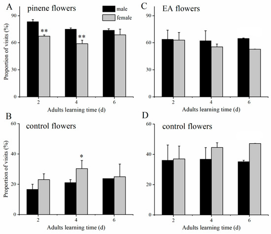 After 2, 4, and 6 days of exposure to α-pinene or EA, both males and females exhibited higher visitation rates to α-pinene- or EA-containing flowers than the control group (Figure 4). Significant main effects of sex (F1,60 = 30.03, df = 1, p < 0.001) and training days (F2,60 = 9.12, df = 2, p = 0.01) were evident; however, no significant interaction effect of sex × training days (F2,60 = 5.25, df = 2, p = 0.07) on the proportion of visits to α-pinene-containing flowers was detected. The visitation rate of males to α-pinene-containing flowers was significantly greater than that of females after 2 and 4 days of training (2 d: F1,60 = 16.76, df = 1, p < 0.001; 4 d: F1,60 = 16.86, df = 1, p < 0.001; Figure 4A). Conversely, females exhibited a stronger preference for sucrose flowers than males after a 4-day training period (F1,60 = 3.98, df = 1, p = 0.05; Figure 4B).