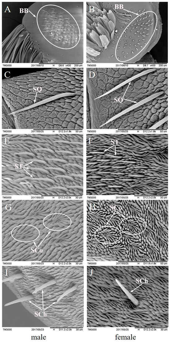 The difference in the type and number of antennal sensilla in adults may also result in learning the difference between males and females. We found five types of sensilla on the antennae of both T. limniace males and females, i.e., Böhm bristles (BB), sensilla squamiformia (SQ), sensilla trichodea (ST), sensilla coeloconica (SCo), and sensilla chaetica (SCh) (Figure 5). There was no difference in the morphology of these antennal sensilla between males and females. However, the estimated numbers of ST and SCo in males were higher than those in females (ST: Z = −91.38, p < 0.001; SCo: Z = −220.84, p < 0.001), while the estimated number of SChs was higher in females than in males (Z = −29.13, p < 0.001) (Table 2).