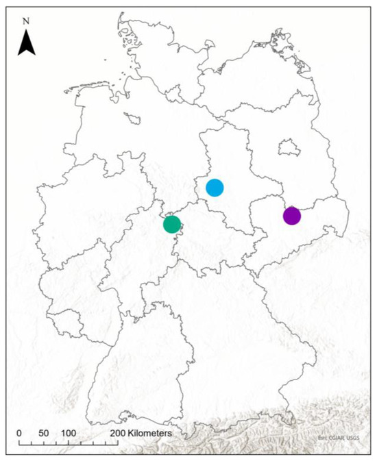 Map of Germany with the location of the model areas, ST = blue, SN = purple, HE = green (map source: Esri, CGIAR, USGS).
