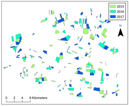 There are different possibilities to obtain information about the location of pea sites. Surveying farmers in a greater area is too labor-intensive. Consequently, a larger dimension to obtain area-wide locations of pea sites is needed. In Germany, one possible format is anonymous InVeKoS (Integriertes Verwaltungs- und Kontrollsystem) data. These data are available in a vector format (polygon shapefiles) and are provided by governmental agencies that are responsible for agricultural subsidies related to the common agricultural policy (CAP) of the EU (Figure 2, Appendix A: Figure A1 and Figure A2). Examples of these programs are “ecological focus areas” or “crop diversification” within the greening direct payments [26,27]. In our study, these geographical locations were used as sample sites and for all further calculations. The data we used were from the years 2015–2019, whereas the data from the year 2015 only served as previous pea site locations, not as sample sites. In the maps of the model areas, we show the examples for the years 2015–2017 to obtain an overview of how close the pea sites are from one to the next year.