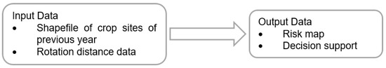 The use of geographic information systems (GIS) within decision support systems (DSS) in agriculture can be very effective and useful, and many different applications already exist [18,19]. If input data are available, they are area-wide applicable. When developing a web tool, using a Python script is convenient, because it is easily adjustable with respect to crop rotation distances and different pests as soon as needed parameters are available. Additionally, automated calculations save a lot of time. For Colorado potato beetles, Weisz et al. [13] developed models to calculate infestation as a function of migratory distance. With one of the models, they created a risk map for planned potato fields, as an interpolated heat map, which shows the infestation risk compared to a non-rotated field. Thus, a risk map according to the crop rotation distance could reduce or avoid infestation by pests in advance.