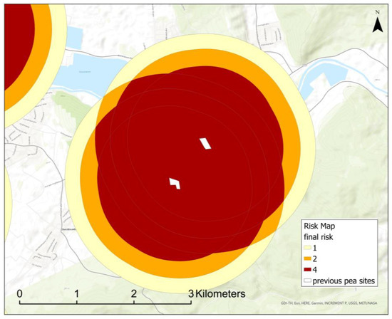 In the past, different approaches to mitigate infestation by insect pests were developed. For example, Weisz et al. [13] developed an “all source model” for Colorado potato beetles by calculating one risk zone or interpolated hotspots with different risk classes for an area, so the new fields can be placed outside the risk zone. In our risk map, there are risk buffers around each previous field, which means that the provided risk areas are much more differentiated. Beckler et al. [29] also created an interpolated abundance map, which shows hot spots of corn rootworms (Diabrotica barberi and Diabrotica virgifera virgifera) emergence. Compared to our approach, both approaches require annual area-wide monitoring, so to reduce the labor required, we decided to use the location of the pea sites as the main input factor.