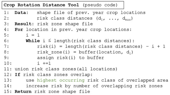 In Figure 5, a pseudo code of the crop rotation distance tool is written. It shows the stylized single steps of the calculation, which are also described above.
