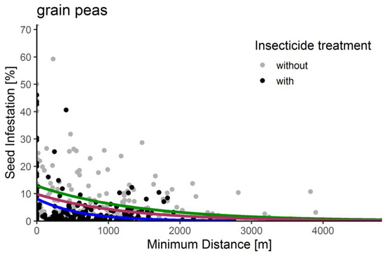 Seed infestation in percent as a function of minimum distance in meters. Each dot depicts one sample site. The gray dots symbolize the sites without insecticide treatment, and the black dots are the ones with insecticide treatment. The red curve shows the exponential decay function of all grain peas, the green curve indicates sites without insecticide treatment (n = 188), and the blue curve indicates sites with insecticide treatment (n = 182).