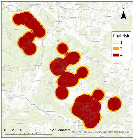 The first part of the calculations results in a risk map, which shows the buffer zones according to risk classes around the crop sites of the previous year (Figure 7). If the infestation risk comes from multiple directions, buffer zones overlap and risk classes are increased to the next highest class, here exponential from two to four.