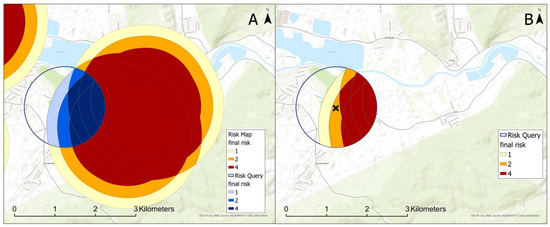 (A): For the user’s query (blue), a buffer around geographical coordinates is clipped out of the risk map. (B): The displayed user output is the clipped region of interest, the ‘×’ marks the queried geographical coordinates. The chosen new pea site has a risk potential, apparently coming from two previous pea sites (map source: GDI-TH, Esri, HERE, Garmin, INCREMENT P: USGS, METI/NASA).