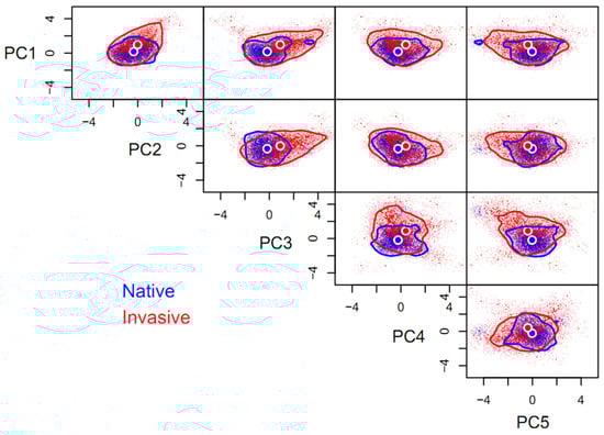 Compared to its native niche hypervolume (HV = 140.41), the space of invasive niche of P. solenopsis (HV = 1692.14) was one-fold larger, with a low degree of niche overlap (βtotal = 0.92) between the invasive and native ranges, as is also indicated by the distance between the centroids (1.53). Niche expansion (βrichness = 0.91) contributed 99.45% of the niche differentiation, while space replacement (βreplacement = 0.01) contributed less than 1%. Niche expansion was extremely pronounced on any of the paired orthogonal axes comprising the five principal components and the native niche hypervolume can be regarded as a subset of the invasive niche hypervolume, in general. Niche expansion occurred mainly along principal component axes other than PC2, favoring high values of PC1, PC3, and PC4, as well as low values of PC5. In contrast, the niche of P. solenopsis was conservative on the PC2 axis (Figure 1).