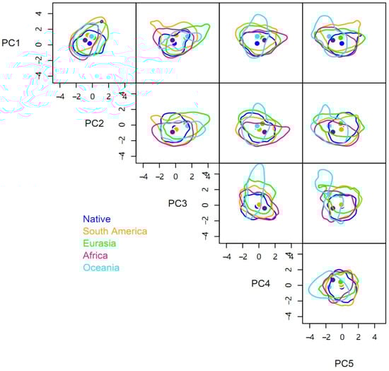 There were significant niche differences between different invasive regions and the native range, with each βtotal being greater than 0.88 (Table 2). In terms of hypervolume sizes, the niches in different invasive ranges were larger than the native niche. The niche of the Oceania population had the largest hypervolume size of 1917.27, followed by those of Eurasia (1197.40) and Africa (1176.13), which are similar, and the smallest niche was that of South America (963.31). The rank order of centroid distances between the native niche hypervolume and the hypervolumes of different invasive ranges was the same as the rank order of the hypervolume sizes (Table 2).