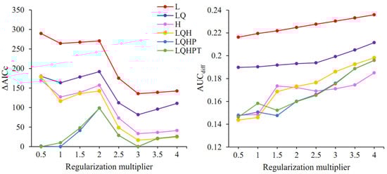 ΔAICc and AUCdiff values of the MaxEnt model under different setting parameters. L: linear; H: hinge; Q: quadratic; P: product; T: threshold.