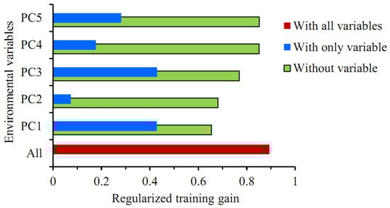 The Jackknife test showed that among the five principal components, the regularized training gain values were higher with PC1 or PC3 alone, with little difference between the two, followed by PC5 and PC4, and the training gain value was lowest with PC2 alone (Figure 4). The training gain decreased significantly when climatic variables other than PC1 or PC2 were used, suggesting that these two principal components better complemented the training data with more information, which was not present in other variables. In summary, all five principal components were key climatic variables affecting the distribution of P. solenopsis.