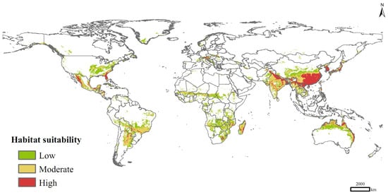 In 2017, Wei et al. [12] analyzed the global suitable habitats for P. solenopsis and categorized its high-suitable habitats using the same threshold as we used in this study. The area of the high-suitable habitats predicted in 2017 is 0.28 × 107 km2, whereas the area predicted by this study is 0.62 × 107 km2, which is consistent with the rapid invasion of P. solenopsis in recent years. Since 2017, P. solenopsis has been found for the first time in North Ethiopia [35], Algeria [37], Shandong in northern China [33], Saudi Arabia [41], Italy [38], Kenya [39], Morocco [40], and Tunisia [42], indicating the startling reality of the northwards invasion of this species. This pest is extremely adaptable to temperature, being especially tolerant to high temperatures [60], and its habitats are likely to expand significantly in the future under climate changes, with North Africa, northern China, areas along the Mediterranean, and northern Europe being high-risk areas for invasion.