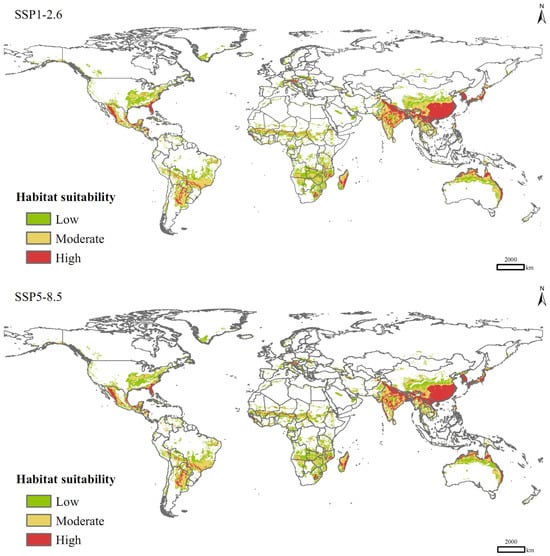 Both current and future bioclimatic data were downloaded from the WorldClim database (version 2.1, http://www.worldclim.org, accessed on 30 March 2024), including 19 bioclimatic variables, at a spatial resolution of 2.5′ (5 km × 5 km). These data have been widely used for niche analysis and the prediction of suitable habitats for invasive insects [43].