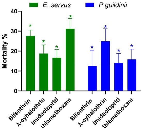 We collected P. guildinii and E. servus from wild host plants in Clarksdale, North Mississippi, where the stink bug populations were not sufficient for five concentrations to determine the LC50 value. Therefore, P. guildinii and E. servus from the Clarksdale-2023 population were exposed to single concentrations of four pesticides at around or higher than the LC50 values calculated from the SIMRU-2023 population to assess differences in their susceptibility. Bifenthrin, λ-cyhalothrin, imidacloprid, and thiamethoxam were applied at concentrations of 10, 10, 10, and 10 µg/mL, and 30, 30, 140, and 95 µg/mL to P. guildinii and E. servus, respectively (Table 2). The Clarksdale-2023 population of P. guildinii and E. servus adults had significantly lower mortalities when exposed to LC50 concentrations of both pyrethroids and neonicotinoids from the SIMRU Farm applications (Figure 1). Across the four pesticides, mortality ranged from 16.7 to 31.2% in E. servus and 12.5 to 25.0% in P. guildinii compared to the 50% mortality (Figure 1).