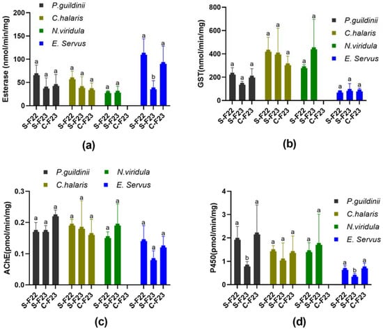 The enzyme activities of esterase (a), glutathione S-transferases (GST) (b), acetylcholinesterase (AChE) (c), and cytochrome P450 complex (P450) (d), for green stink bug (Chinavia halaris), southern green stink bug (Nezara Viridula), brown stink bug (Euschistus servus), and redbanded stink bug (Piezodorus guildinii) from three different populations: SIMRU-2022 (S-F22), SIMRU-2023 (S-F23), and Clarksdale-2023 (C-F23). Statistically significant differences were identified within each group of enzymes. Means sharing different letters on the top of the bars are significantly different, as determined using one-way analysis of variance with Tukey’s HSD test, and significant values were set at p < 0.05.