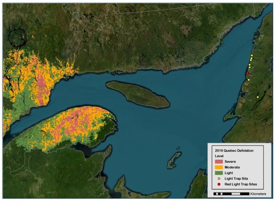 The spruce budworm, Choristoneura fumiferana Clem. (Lepidoptera: Tortricidae), is a severe epidemic defoliator of conifers [balsam fir, Abies balsamea, and spruce trees, Picea sp.] in eastern Canada and the northeast states in the U.S.A. [1,2,3]. Concomitant with the large-scale outbreak of budworms in the province of Québec, two massive immigrations of females were detected in light traps (LTs) deployed in Sally’s Cove in 2017 and 2018 (red dot in Figure 1), which led to a fortyfold two-year increase in the abundance of overwintering larvae from 0.2 to 8.6 individuals per branch [2] and nearly one million adults in 16 LTs in 2019 (Section 3). The initial research question at hand (the recognition of immigration patterns in LTs) was defeated by the a posteriori obvious reality that immigration is hard to discern in a high local density of adults. On the other hand, the high numerical abundance (106) in 2019 suggests that budworm populations could in theory be managed by luring females to death with LTs—noting that studies explicitly designed to validate mass trapping in agricultural settings rarely attain 106 individuals in LTs for any given year, even when hundreds of traps are deployed (Section 2). With some leap of faith, the rationale for mass trapping spruce budworms is inferred numerically.