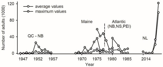 Abundance of adult spruce budworms in light traps in Canadian provinces of Québec and New Brunswick between 1947 and 1957 [101], in state of Maine between 1968 and 1977 [102,103], in Atlantic Canada between 1976 and 1986 (provinces of New Brunswick, Nova Scotia, and Prince Edward Island) [104], and on west coast of Newfoundland (Sally’s Cove) between 2014 and 2019 [2].