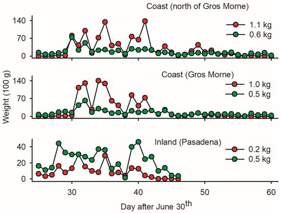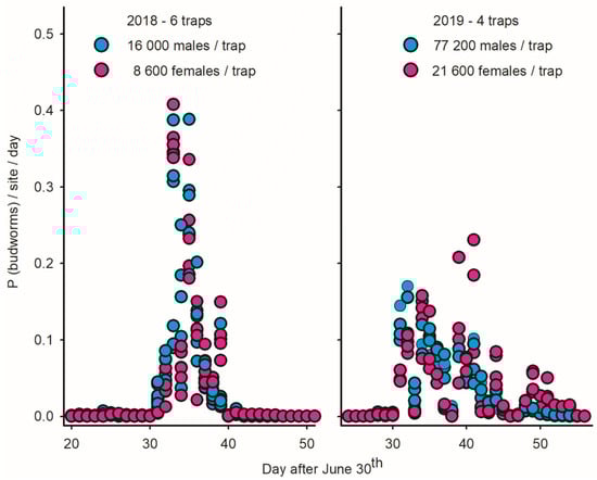 The low ratio of budworm biomass relative to non-targets in LTs in Pasadena (0.2 versus 0.5 kg; Figure 4) implies that inland mass trapping is not sound due to the substantial removal of beneficial insects. In coastal sites, in contrast, the mass of budworms was two times larger than the mass of non-targets (Figure 4)—suggesting a ‘limited’ non-target cost of LTmt in budworms. Based on wp/wb ratios, the first ten days of August provided optimal timing for mass trapping budworms.