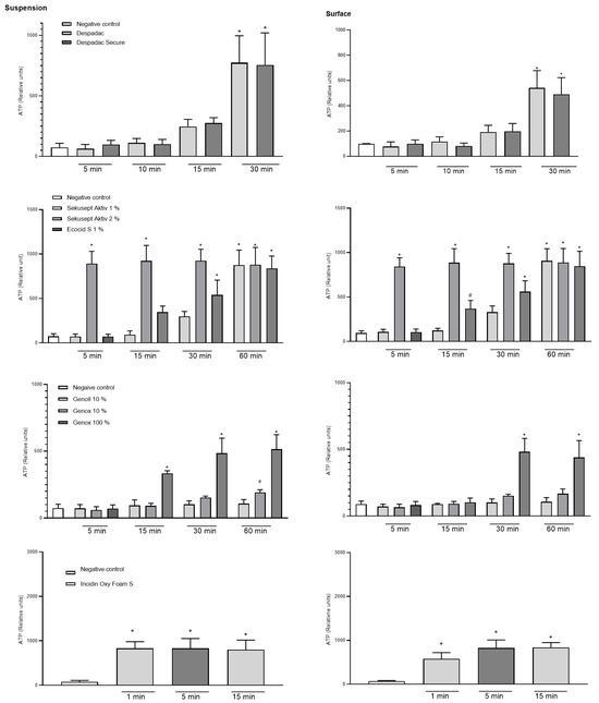 Summary of the relative units of ATP caused by disinfectant products Despadac, Sekusept Aktiv, Ecocid S, Genox and Genoll, and Incidin Oxy Foam S on the growth of P. larvae bacteria. Results for all genotypes treated with disinfectant are merged into one column. The results are shown as the mean ± standard error of at least three repetitions; * p < 0.0001; # p < 0.001.