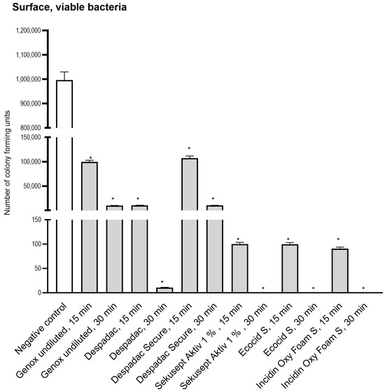 We applied 1 million microorganisms onto a dry and smooth surface (square 10 cm2) and, following disinfectant action, found a reduced number of viable bacteria (using CFU method) for all disinfectants applied (Figure 3). We found the reduction to 100672 CFU for undiluted Genox (100%) after 15 min and 9976 CFU after 30 min, which was similar to the reduction achieved after application of Despadac Secure. The decreases in Despadac reached 10025 CFU and 11 CFU, respectively. Sekusept Aktiv (1%) and Ecocid s (1%) reduced the number of viable bacteria after 15 min for 4 Log (cca 100 CFU remained viable) and after 30 min for 6 Log (cca 1 CFU remained). Incidin OxyFoam S at decreased the number of CFU: after 15 min to 90.70 and after 30 min to 1, corresponding to a five and six Log reduction.