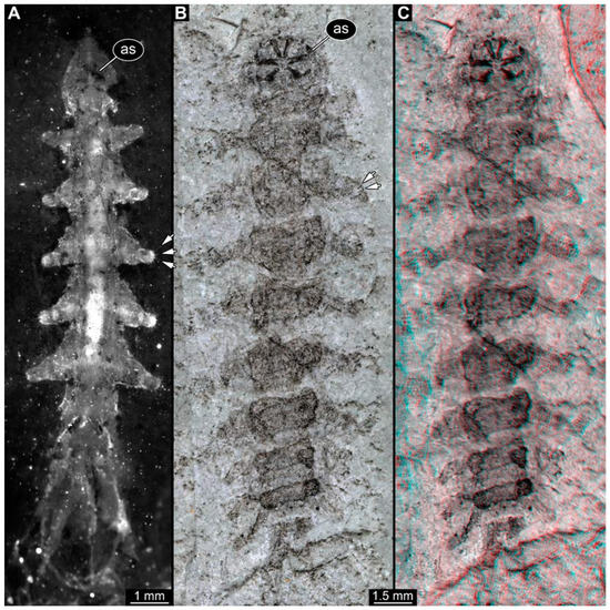 Additional larval specimens of Qiyia jurassica Chen et al., 2014, middle Jurassic, Daohugou, China. (A) PED 3176, dorsal view, composite autofluorescence image; arrows mark crochets on legs. (B,C) PED 3225, ventral view. (B) Composite image under cross polarised light; arrows mark crochets on legs. (C) Red-cyan stereo-anaglyph image highlighting the relief of the structurer; please use red-cyan glasses to view. Abbreviation: as = attachment structure formed by head and thorax region.