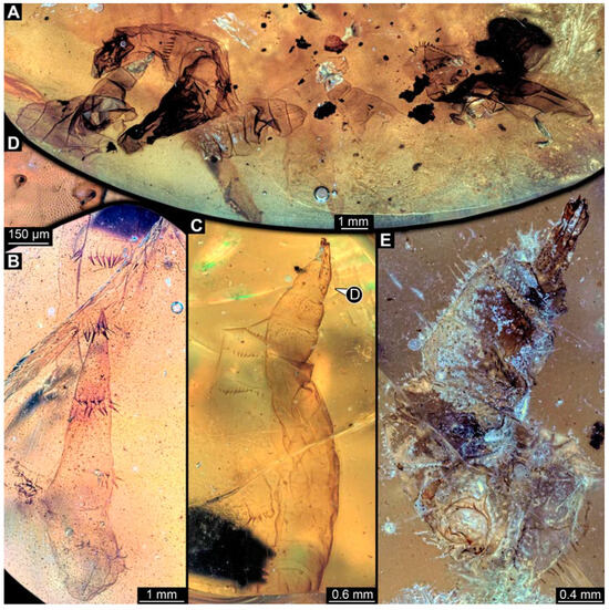 - Baranov, V.; Schädel, M.; Haug, J.T. Fly Palaeo-Evo-Devo: Immature Stages of Bibionomorphan dipterans in Baltic and Bitterfeld Amber. PeerJ 2019, 7, e7843. [Google Scholar] [CrossRef] [PubMed]