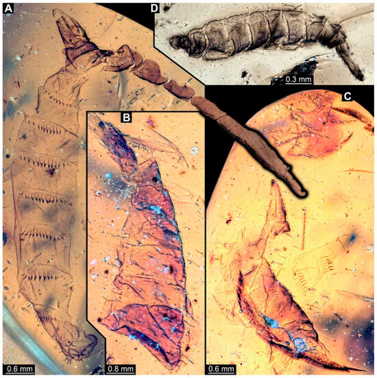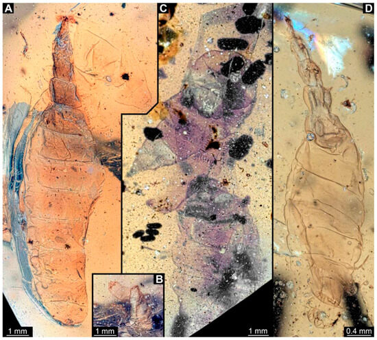 Larval specimens of stratiomyomorphan flies morphotype 1, late Cretaceous, Kachin amber, Myanmar, continued. (A) PED 3509-1. (B) PED 3509-2. (C) PED 3509-3 and 3509-4. (D) PED 2659.