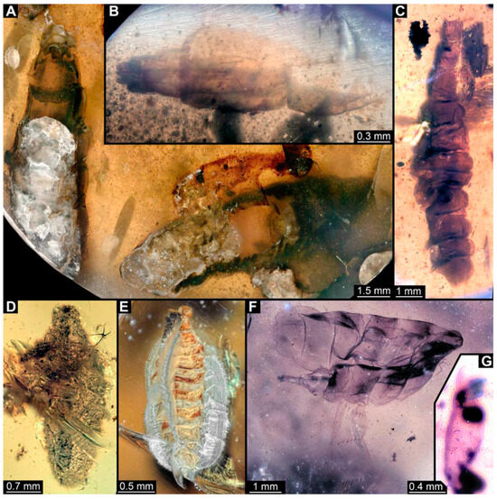 Larval specimens of stratiomyomorphan flies morphotype 1 and unclear specimens, late Cretaceous, Kachin amber, Myanmar. (A) PED 1951, with remains of two specimens. (B) PED 2012. (C) PED 2000. (D) PED 2287. (E) PED 2562. (F) PED 3650, morphotype 1. (G) PED 2505.