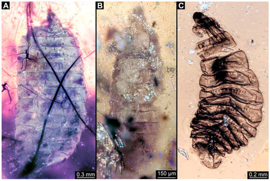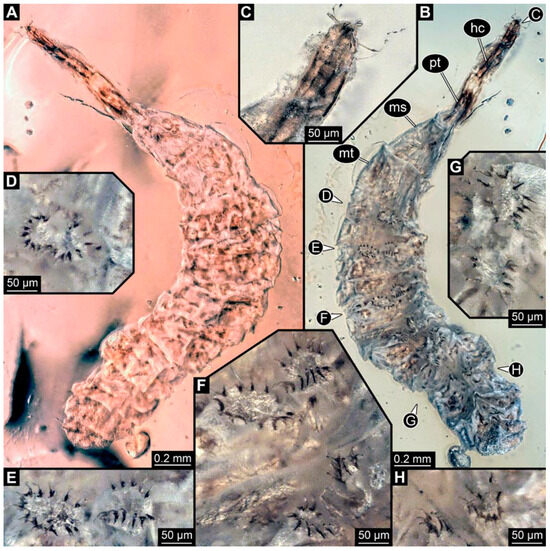Several of the herein-reported larvae from Myanmar amber (BUB 4258, PED 1435, 3591, 3470, 2159, and possibly also 3408; Figure 11, Figure 12, Figure 13 and Figure 14) appear to represent a single morphotype, the elongate chimera morphotype. Yet, specimen BUB 4258 differs from the others by the texture of the cuticle being tessellated (Figure 11A), while those of the others have distinct tightly spaced dorso-ventral folds (Figure 12C, Figure 13A and Figure 14A,E). Additionally, PED 1435 seems to have a more distinctly sclerotized trunk end. Both differences might be due to preservation conditions.