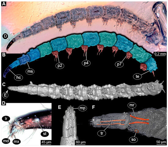 Specimen of new larval brachyceran elongate chimera morphotype, BUB 4258, late Cretaceous, Kachin amber, Myanmar. (A,B) Compound images, light microscopy. (A) Overview. (B) Colour-marked version of (A). (C) Overview in ventral view, surface model based on synchrotron-CT-scans. (D) Close-up on head region, compound image, light microscopy. (E) Close-up of head region, surface model based on synchrotron-CT-scans. (F) Close-up of anterior body region, volume rendering based on synchrotron-CT-scans. Abbreviations: hc = head capsule; lr = labrum; md = mandible; mp = mouthparts; mr = metacephalic rod; ms = mesothorax; mx = maxilla; p2–7 = proleg of abdominal segments 2–7; st = stemma; so = spiracle opening; te = trunk end; tr = tentorial rod.