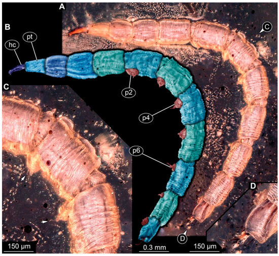Specimen of new larval brachyceran elongate chimera morphotype, PED 1435, late Cretaceous, Kachin amber, Myanmar. (A) Overview. (B) Colour-marked version of (A). (C) Close-up of trunk surface with distinct folding pattern; arrows indicate hook at tip of proleg. (D) Close-up of trunk end. Abbreviations: hc = head capsule; p2–6 = proleg of abdominal segments 2–6; pt = prothorax.