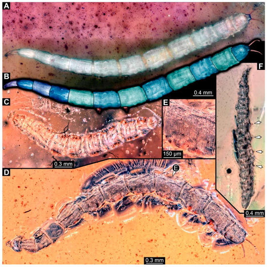 Most specimens represent stratiomyomorphan larvae of morphotype 1. These larvae present autapomorphies of Stratiomiomorpha, such as the distinct mandibular-maxillary complex and integument covered by pellets in a honeycomb pattern. This morphotype can be distinguished from the others by the slenderer body, presence of long triangular spines on the tergites, and smaller rounded spines on the sternites (detailed description in [10,19]). In total 26 specimens were examined: PED 1606 (Figure 2A), 1832 (Figure 2B,C), 1834 (Figure 2D,E), 1861 (Figure 3A, 5 specimens), 1880 (Figure 3E), 1892 (Figure 3C,D), 1893 (Figure 3B), 1938 (Figure 4A), 1943 (Figure 4D), 1963 (Figure 4C), 1965 (Figure 4B), 2233-1 (Figure 5A), 2233-2 (Figure 5B), 2450 (Figure 5C, 2 specimens), 2651 (Figure 5D), 2659 (Figure 6D), 3509-1 (Figure 6A), 3509-2 (Figure 6B), 3509-3 (Figure 6C), 3509-4 (Figure 6C), and 3650 (Figure 7F).