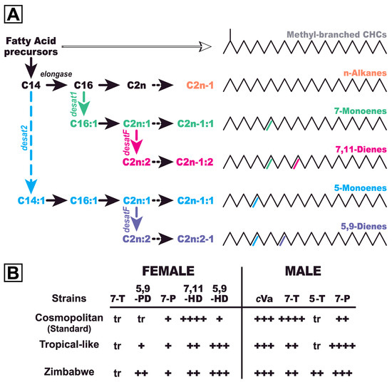 - Dallerac, R.; Labeur, C.; Jallon, J.M.; Knippie, D.C.; Roelofs, W.L.; Wicker-Thomas, C. A delta 9 desaturase gene with a different substrate specificity is responsible for the cuticular diene hydrocarbon polymorphism in Drosophila melanogaster. Proc. Natl. Acad. Sci. USA 2000, 97, 9449–9454. [Google Scholar] [CrossRef]