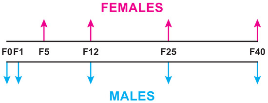 Temporal sampling procedure for chemical analysis. Arrows represent the generations (F) at which flies were sampled for chemical analysis: for females (above; at F5, F12, F25 and F40) and males (below; F0, F1, F12, F25, F40).