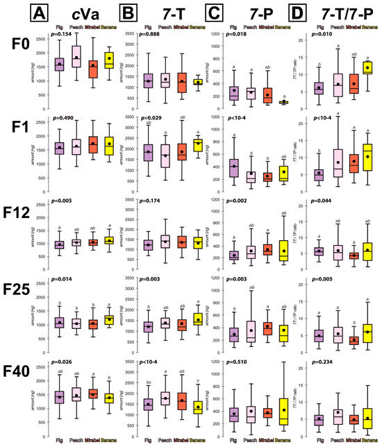 7-T/7-P ratio. Between groups: The differences observed at F0 (highest ratio in “Banana” group), at F1 (lowest in “Fig” group), and at F12 and F25 (lowest in “Mirabel” group) were not seen at F40 (Figure 3D).