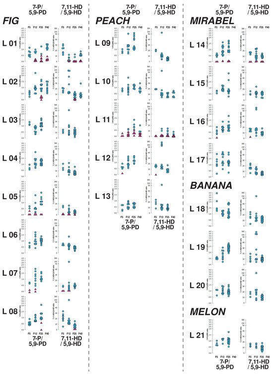 Between generations: The 7-T/7-P ratio constantly declined between F0 and F40 in the “Fig”, “Mirabel” and “Banana” groups but remained stable in the “Peach” group (Supplementary Figure S3D).