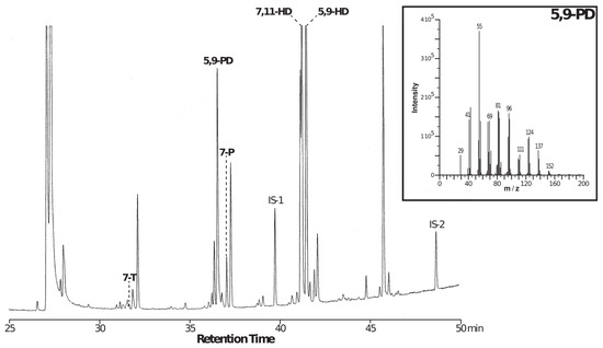 We also performed a GC-MS analysis to ascertain compound identity in tropical-like females. The ion fragmentation profile indicated that one of the most abundant compounds identified in tropical-like females was 5,9-PD (Figure 5), although 5,9-HD was also abundant. Out of a total of five females tested by GC-MS for each line, three “Fig 1” and five “Peach 3” females showed a tropical-like CHC profile, while the two other lines showed none. Therefore, with GC and GC-MS data pooled, “Fig 1” and “Peach 3” lines, respectively, produced a total of 9/18 (50%) and 12/15 (80%) tropical-like CHC females at F40.