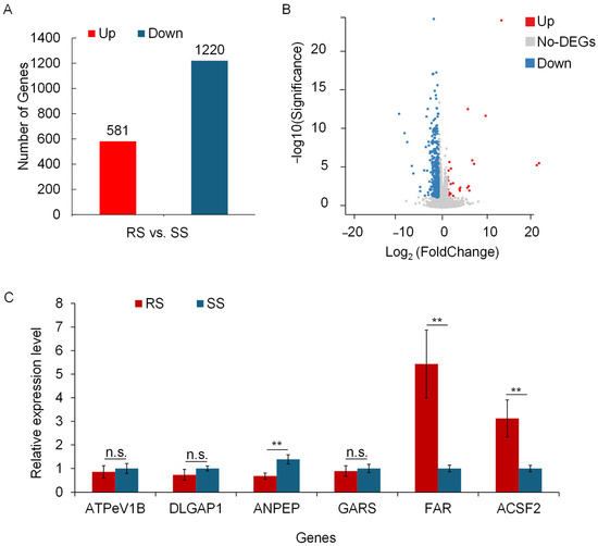 Analysis of differentially expressed genes (DEGs) between RS and SS aphid strains in the transcriptome. (A) Bar chart of the number of DEGs. Red represents the number of upregulated DEGs in RS, while blue represents the number of downregulated DEGs. (B) Volcano plot of significant DEGs. Dots represent individual genes. Blue dots represent significantly downregulated DEGs in RS, and red dots represent significantly upregulated DEGs. Grey dots indicate DEGs that are not significant between RS and SS. The data were analyzed with ANOVA (p < 0.05). (C) Quantitative real-time PCR (qRT-PCR) verification of ATP6V1, DLGAP1, FAR, and other genes after acetamiprid treatment. Each sample with different genes had three replicates. Significance analysis was conducted with ANOVA. Values are means ± SEM of three experiments. ** p < 0.01; n.s. not significant (p > 0.05).
