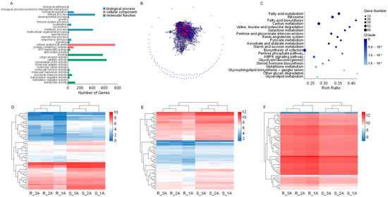 Gene ontology (GO) annotation and Kyoto Encyclopedia of Genes and Genomes (KEGG) pathway enrichment analysis of differentially expressed genes (DEGs) between RS and SS strains in the transcriptome. (A) GO classification of DEGs, showing the number of DEGs in different categories. Most of the DEGs were genes related to the biosynthesis of cellular anatomical entities, catalytic activity, and metabolic processes. (B) 628 genes of catalytic activity network with three genes at key nodes, including triosephosphate isomerase (TPI), glucose-6-phosphate isomerase (PHI) and delta-1-pyrroline-5-carboxylate synthetase (P5CS). (C) KEGG enrichment of DEGs. (D) Heatmap analysis of hierarchical clustering of DEGs in fatty acid metabolism. (E) Heatmap analysis of hierarchical clustering of DEGs in carbon metabolism. (F) Heatmap analysis of hierarchical clustering of DEGs in the ribosome. Red and blue indicate high and low expression in RS, respectively.