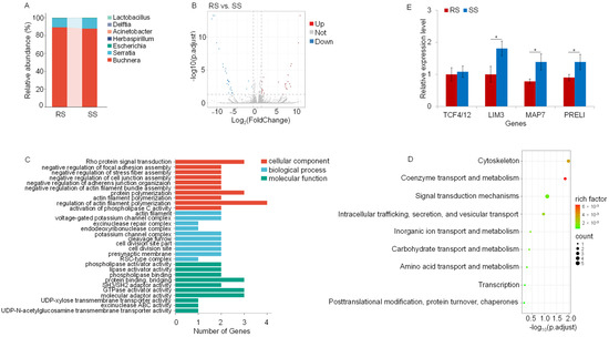 Analysis of differentially expressed genes (DEGs) between RS and SS strains in the metatranscriptome. (A) Bar chart of the relative abundance of bacteria. Different colors represent different species, according to the legend on the right. The color filling of the intervals and lines can visually reflect the changes in the relative abundance of the species. (B) Volcano plot of significant DEGs in the metatranscriptome. Dots represent individual genes. Blue dots represent significantly downregulated DEGs in RS, and red dots represent significantly upregulated DEGs. Grey dots indicate DEGs that are not significant between RS and SS. The data were analyzed using ANOVA (p < 0.05). (C) Gene ontology (GO) classification of downregulated DEGs in the metatranscriptome. (D) EuKaryotic Ortholog Groups (KOG) of downregulated DEGs. The horizontal axis represents the gene ratio. The bubble color indicates the p value, and the color gradient represents the magnitude of the p value, converted from −log10. The closer the color is to red, the lower the p value and the more significant the enrichment. The size of the bubbles indicates the number of DEGs in the functional class (the larger the bubbles, the greater the quantity). (E) Real-Time Quantitative Reverse Transcription PCR (qRT-PCR) of TCF4/12, LIM3, MAP7 and PREL. The qRT-PCR of the different genes was replicated three times. Significance analysis was conducted with ANOVA. Values are mean ± SEM of three experiments. * p < 0.05.