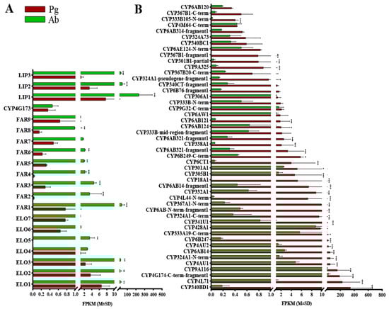 Expression levels of the candidate genes in the tea geometrid (E. obliqua) based on the FPKM values, according to comparative RNAseq analyses. (A) ELO, FAR, DEC, and LIP genes with higher FPKM values in the abdomen. (B) P450s with higher FPKM values in the pheromone gland. Pg and Ab indicate the pheromone gland and the abdomen, respectively. Asterisks represent significant differences between the two tissues based on the Bonferroni t-test (* p < 0.05, ** p< 0.05, *** p < 0.001).