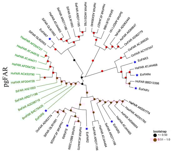 Phylogenetic tree of eight E. obliqua FARs predominantly expressed in the abdomen and those from different lepidopteran species. The FAR sequences were retrieved from GenBank and the EST database using BLAST searches with EoFARs as queries. The tree was constructed with MEGA 7.0 based on the amino acid sequences using the neighbor-joining algorithm with the p-distance model. A total of 1000 bootstrap replicates were used. FARs specific to PGs are highlighted in green, and the blue stars indicate FARs from E. obliqua. Species abbreviations are as follows: Eo, E. obliqua; Ha, Helicoverpa armigera; Se, Spodoptera exigua; Hc, Hyphantria cunea; Has, Helicoverpa assulta; Si, Streltzoviella insularis; Ba, Bicyclus anynana; Hs, Heliothis subflexa; As, Agrotis segetum; Hv, Heliothis virescens; On, Ostrinia nubilalis; Os, Ostrinia scapulalis; Ye, Yponomeuta evonymella.