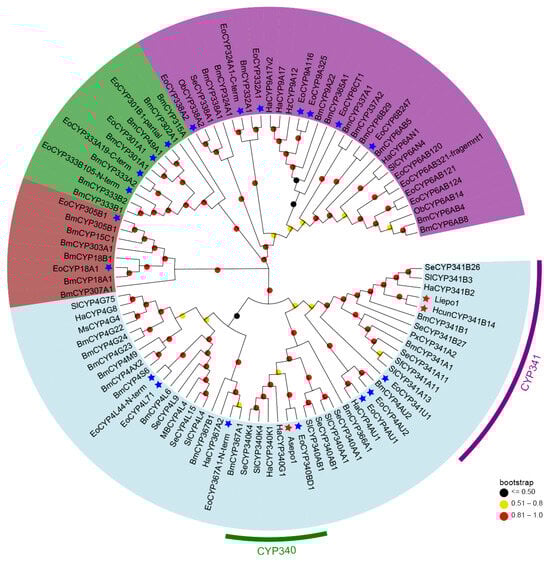 Phylogenetic analysis of 24 E. obliqua CYPs predominantly expressed in pheromone glands and those from other insect species. Full-length protein sequences of CYPs from E. obliqua and other insects were aligned using ClustalW. The tree was constructed with MEGA 7.0 using the maximum-likelihood method based on the JTT model and tested with a bootstrap value of 1000. Dots with different colors at each branch point represent the bootstrap values. Different background colors indicate the CYP2 clan (dark brown), CYP3 clan (purple), CYP4 clan (light blue), and mitochondrial CYP clan (green). The CYPs marked with blue stars indicate EoCYPs, while the CYPs marked with red stars indicate the 3,4-epoxidase identified in the CYP340 family and the 9,10-epoxidases in the CYP341 family. Species abbreviations are as follows: Eo, E. obliqua; Bm, Bombyx mori; Ha, Helicoverpa armigera; Hz, Helicoverpa zea; Sl, Spodoptera littoralis; Se, Spodoptera exigua; Px, plutella xylostella; Ob, Operophtera brumata; Ms, Manduca sexta; Sf, Spodoptera frugiperda.