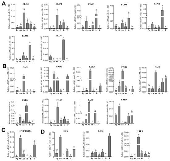 Tissue expression patterns of candidate ELOs, FARs, DECs and LIPs in E. obliqua based on RT-qPCR analyses. (A–D) indicates expression pattern of ELOs; FARs; DEC and LIPs, respectively. Data are shown as means ± standard deviations. Different letters above the bars represent significant differences (p < 0.05, one-way ANOVA with a post hoc Duncan’s test). Pg, pheromone gland; Ab, abdomen; An, antennae; H, head; L, legs; T, thorax.
