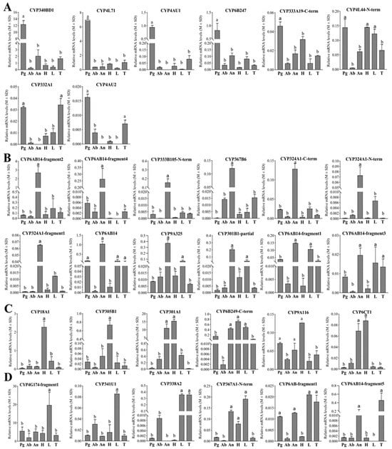 Tissue expression profiles of the 32 preselected pheromone-gland-enriched CYPs in E. obliqua based on qPCR analyses. (A) The 8 CYPs with upregulated expression in pheromone glands. (B) The 12 CYPs with upregulated expression in antennae. (C) The 6 CYPs with upregulated expression in head. (D) The 5 CYPs with upregulated expression in legs and the 1 CYP with upregulated expression in the thorax. Abbreviations: Pg, pheromone gland; Ab, abdomen; An, antennae; H, head; L, leg; T, thorax. Different letters indicate that the expression levels are significantly different (p < 0.05).
