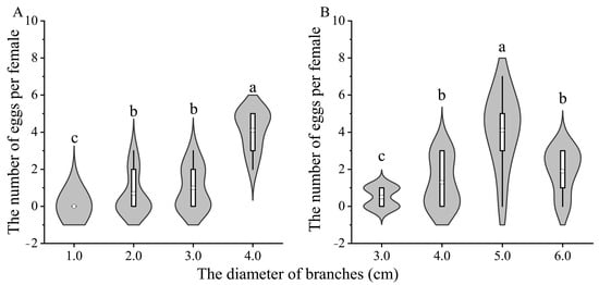 2.3.3. Oviposition Selection on Branches with Different Diameters