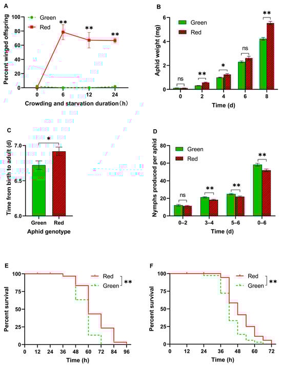 Biological parameters of red and green aphids. (A) Percentage of winged offspring after different crowding and starvation periods (Student’s t-test, n = 6). (B) Weight of pea aphids at different development times (Student’s t-test, n = 8). (C) Development time from birth to adults (Student’s t-test, n = 18). (D) Number of offspring produced by each aphid in the first 6 days of adulthood (Student’s t-test, n = 18). (E,F) Starvation tolerance under high humidity (E) or room conditions (F) (log-rank test, n = 30). Data are shown as mean ± SEM. * p < 0.05, ** p < 0.01. ns: no significance.