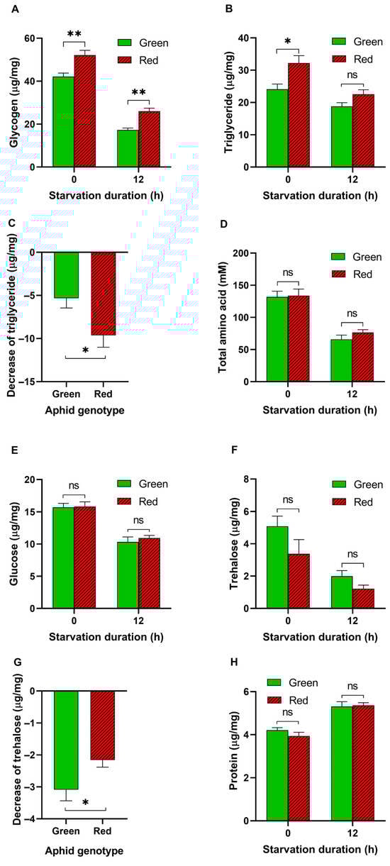 We found that the glycogen (t = 3.575, df = 14, p = 0.003; Figure 2A) and triglyceride (t = 2.874, df = 14, p < 0.05; Figure 2B) levels in the red pea aphids were significantly higher than those in the green pea aphids. After crowding and starvation for 12 h, both color aphids exhibited a decrease in glycogen and triglyceride levels. Notably, the decrease in triglycerides was greater in red pea aphids (9.6 μg/mg) than in green pea aphids (5.3 μg/mg) (t = 2.424, df = 14, p < 0.05; Figure 2C). There was no significant difference in the total amount of amino acids, glucose, trehalose, or protein in both color aphids (Figure 2D–F,H), while the decrease in trehalose was greater in green pea aphids than in red pea aphids (t = 2.269, df = 14, p < 0.05; Figure 2G) after 12 h of starvation.