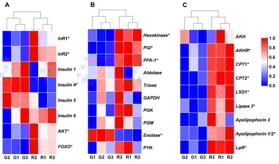 Expression of genes involved in insulin pathway and energy metabolism. (A) Heatmap showing genes involved in insulin pathway in pea aphids. (B,C) Heatmap representing expression levels of genes related to glycolysis (B) and lipolysis (C) in pea aphids. Heatmap representing log2 fold change values between red and green aphids. Scale method: zero to one. Red color represents higher expression, while blue represents lower expression. Student’s t-test, n = 3, * p < 0.05. Abbreviations: G1–3: Green aphid replicate 1–3; R1–3: Red aphid replicate 1–3; InR1: insulin receptor 1; InR2: insulin receptor 2; AKT: protein kinase B; FOXO: forkhead transcription factor subgroup O; HK: hexokinase; PGI: glucose-6-phosphate isomerase; PFK-1: phosphofructokinase-1; GAPDH: glyceraldehyde-3-phosphate dehydrogenase; PGK: phosphoglycerate kinase; PGM: phosphoglycerate mutase; PYK: pyruvate kinase; AKH: adipokinetic hormone; AKHR: adipokinetic hormone receptor; CPT1: carnitine O-palmitoyltransferase 1; CPT2: carnitine O-palmitoyltransferase 2; LSD1: lipid storage droplet protein 1; LpR: lipophorin receptor.